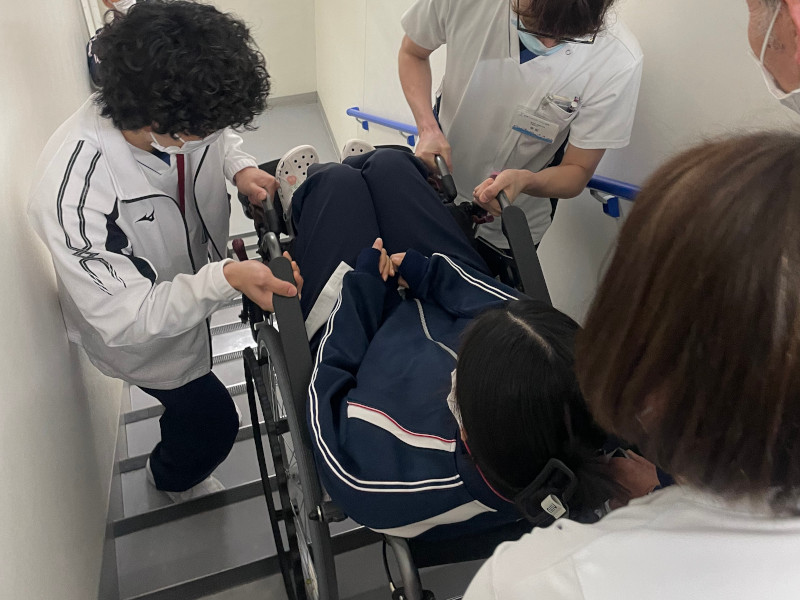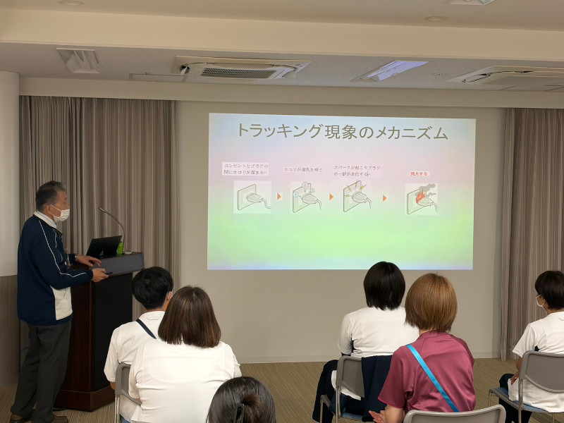万一の火災発生に備え、院内にて自衛消防訓練を実施しました。座学での学習をはじめ、通報訓練、水消火器による初期消火訓練、車椅子利用者を想定した階段昇降訓練など、実際の場面を想定した内容で行いました。